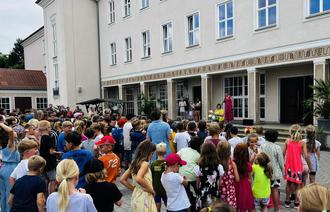 Die Schülerinnen und Schüler der Traugott-Hirschberger-Grundschule verabschieden sich am letzten Tag auf dem Schulhof mit einem Lied von Schulleiterin Frau Gulbin.