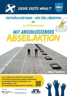 Im Anschluss, um 15 Uhr, wird es für alle Interessierten eine Abseilaktion am Lübbenauer Spreewaldhaus geben. Unter professioneller Anleitung mit dem Team von Prima Abenteuer geht es in schwindelerregende Höhe. Neben dem spektakulären Adrenalinkick gibt es einen wunderschönen Ausblick über unsere Spreewaldstadt. Für die Versorgung vor Ort ist gesorgt. Erstwählerinnen und Erstwähler haben die Möglichkeit sich über die Internetseite der Stadt Lübbenau/Spreewald www.luebbenau-spreewald.de für dieses Event anzumelden.
