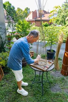 Inzwischen gibt er selbst Flecht- und Webkurse, gestaltet Spinnabende und kreiert dabei immer wieder neue Ideen. Da die Besucherinnen- und Besucher, der oft gerade mal nur zweistündigen Kurse, auch gerne etwas mit nachhause nehmen möchten, entstehen manchmal auch nur kleinere Behältnisse wie Futterkörbchen für Vögel oder kleine Tischkörbchen.