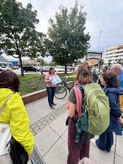 Die Route führte über das Wohnviertel an der Straße der Einheit, vorbei am Kolosseum bis hin zum zukünftigen Lindenviertel, einem Neubauprojekt mit Vorbildcharakter. Fachbereichsleiter der Stadtverwaltung Sven Blümel, Bereichsleiterin Kerstin Schäfer und die Klimaanpassungsmanagerin Julia Schumann erläuterten entlang der Strecke, wie Stadtgrün, Entsiegelung, Regenwassermanagement und klimaangepasstes Bauen zur Abmilderung der Klimafolgen beitragen.