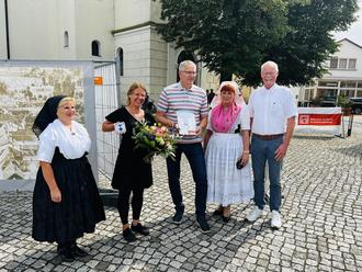 Vorstandsvorsitzender der AG Bodo Broszinski überreicht die Auszeichnung zum "Denkmal des Monats" an Pfarrerin Ulrike Garve, weitere: Fachbereichsleiter Sven Blümel sowie Andrea Pursche und Katrin Hanisch vom Verein Rubiško
