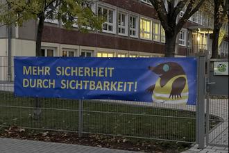 Banner "Mehr Sicherheit durch Sichtbarkeit" am Eingang der Werner-Seelenbinder-Grundschule