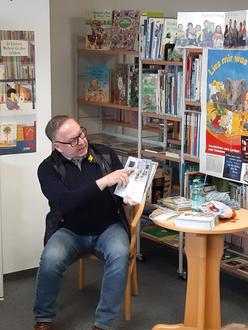Bürgermeister Helmut Wenzel als Vorleser für den bundesweiten Vorlesetag 2024 in der Bibliothek Lübbenau-Vetschau
