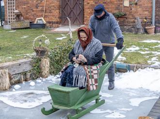 Wenn es zum Nachbarn am anderen Dorfende ging, weil es mal etwas zum Feiern gab, wurde der Stoßschlitten benutzt. Die Dame, gut gegen Kälte geschützt, wurde vom Gatten auf Schlittschuhen über die Fließe geschoben. Für diese Szene zog sich Marlene Jedro alles an warmen Sachen an, was die Wintertracht hergab und ließ sich von Thomas Hegemer übers Eis schieben. Das nicht ganz einfache Ein- und Aussteigen bot auch hier wieder den Fotografen zahlreiche Motive. Beide Darsteller mussten das mehrmals wiederholen, weil die Fotografierenden ihre Positionen wechseln wollten.