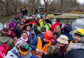 Während anderswo meist nur die Straßenseiten gewechselt werden, geht es in Lehde nahezu sportlich zu: Um möglichst viele im Spreewalddorf aufsuchen zu können, um dort Zampergaben zu erheischen, müssen Brücken mehrmals überquert werden, manche Wege müssen mehrfach gegangen werden. Einige Höfe können nur übers Fließ erreicht werden. Manche Fließe waren allerdings schon eisfrei, sodass die ganze Gesellschaft, über 50 Personen, mit einem Lastenkahn einen Teil der Zamperstrecke bewältigen konnte.