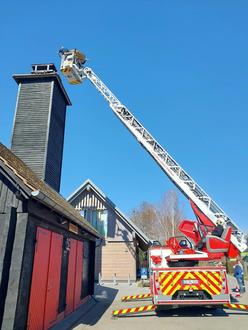 Platzierung des neuen Storchenhorstes auf dem Schlauchturm des Feuerwehrgerätehauses in Lehde