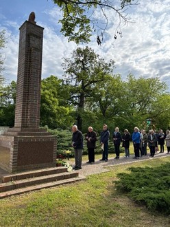 Rund 100 Menschen versammelten sich am Sowjetischen Ehrenfriedhof in der Straße des Friedens, um gemeinsam am 8. Mai an das Ende des Zweiten Weltkriegs und die Befreiung Deutschlands vom Nationalsozialismus vor 80 Jahren zu erinnern.