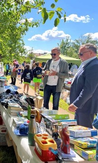 Bürgermeister Helmut Wenzel im Gespräch beim Kinderflohmarkt am Spielplatz "Spreewaldreich"