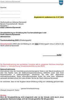 Gemäß § 8 Absatz 1 der Tourismusbeitragssatzungder Stadt Lübbenau/Spreewald mit ihren Ortsteilen ist der 31.07.2025 Termin für die Meldung des Gesamtumsatzes für die Berechnung des Tourismusbeitrages 2023.