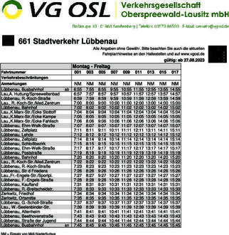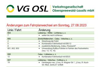 Mit dem neuen Fahrplan der Verkehrsgesellschaft Oberspreewald-Lausitz mbH (VG OSL) gibt es Anpassungen auf verschiedenen Strecken. Alle Fahrplan- und Haltestellenänderungen können Sie auf der Homepage der VG OSL unter www.vgosl.de/Aktuelles einsehen.