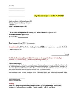 Gemäß § 8 Absatz 1 der Tourismusbeitragssatzung der Stadt Lübbenau/Spreewald mit ihren Ortsteilen ist der 31.07.2024 Termin für die Meldung des Gesamtumsatzes für die Berechnung des Tourismusbeitrages 2022.