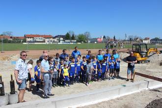 Bürgermeister Helmut Wenzel, Vorsitzender der SVV Uwe Pielenz und Sportlerinnen und Sportler bei der Grundsteinlegung Foto: Stadt Lübbenau/Spreewald