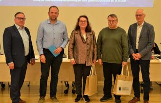v.l.n.r.: Bürgermeister Helmut Wenzel, Scheidende Schiedsperson Benjamin Wepprich, neu gewählte Schiedsperson Ulrike Neundorf, Mitbewerber Ralf Laur, Vorsitzender der SVV Uwe Pielenz bei der Wahl zur neuen Schiedsperson