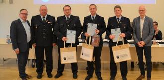 Wahl zur neuen Stadtwehrführung: v.l.n.r. Bürgermeister Helmut Wenzel, Hartmut Wassermann, Andreas Bromberger, Martin Neumann, Marco Gerska, Vorsitzender der SVV Uwe Pielenz