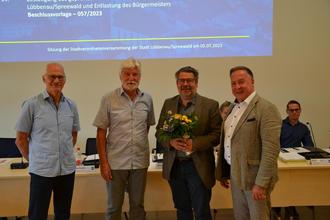 Roland Herrmann (2. v. r.) ist neue Schiedsperson in Lübbenau/Spreewald. Er übernimmt die Aufgabe von xxx (3. v. r.). Bürgermeister Helmut Wenzel (r.) und Uwe Pielenz, Vorsitzender der Stadtverordnetenversammlung, gratulieren zur Wahl.