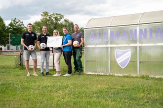 Überreichung des symbolischen Spendenschecks auf dem Sportplatz in Altdöbern (v.l.n.r. Steven Lubitz und Mirko Buder vom SSV Alemannia sowie Katja Reimann, Sindy Weiher und Mario Dietz von der WIS Wohnungsbaugesellschaft)