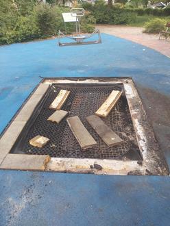 Trampolin auf dem Zeitlos Spielepark durch Brand zerstört
