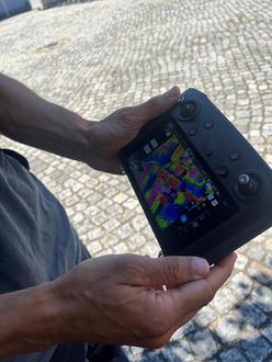 Display der Wärmebilddrohne zeigt thermische Aufnahmen definierter Messpunkte im Stadtgebiet.