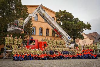 Am Samstag ging es weiter mit dem Programm. Um 12 Uhr mussten sich alle Kameraden und Kameradinnen aus der aktiven und Alters- und Ehrenabteilung, sowie alle Mitglieder der Kinder- und Jugendfeuerwehr bei der Feuerwehr einfinden. Denn ein neues „Mannschaftsfoto“ wurde auf dem Marktplatz gemacht.