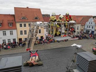 Am Nachmittag waren trotz leichtem Nieselregen viele Besucher zum Marktplatz gekommen, um den Vorführungen zu folgen. Nachdem ein Notruf zur Leitstelle abgesetzt wurde und der Alarm auf den Piepern ertönte, begannen unsere Jüngsten mit den ersten Löschmaßnahmen, unterstützt von der Jugendfeuerwehr und der erste Brand war schnell gelöscht. Kurz darauf wurde eine weitere Holzhütte angezündet. Anschließend waren Rufe aus dem Hausmannsturm zu hören, es erklang die Sirene vom Mönchhof und die Handdruckspritze wurde auf den Markt per Hand gezogen. Mit Unterstützung der Bürger konnten die ersten Löschmaßnahmen eingeleitet werden. Weitere Kräfte wurden nachalarmiert; somit kam unsere Alters- und Ehrenabteilung zum Einsatz. Mit dem Traditionsfahrzeug „SIL“ wurde das Feuer dann gelöscht.