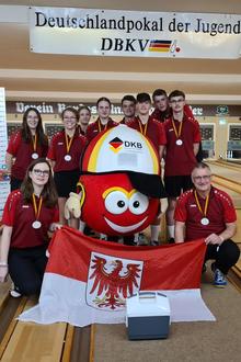 Team Brandenburg (h. v. l.: T. Schultz, J. Charchulla, F. Schwanda, H. Krüger, L. Schäfer, L. Zimmermann, P. Niendorf; v. v. l.: Betreuerin A. Jakobza, Maskottchen Kebowlino, Betreuer T. Findeisen
