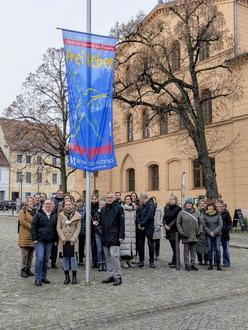 Neben dem Bürgermeister Gerald Lehmann, haben sich Vertreter des Landkreises Dahme-Spreewald, aus der Politik und dem Rathaus zum Hissen der Fahne auf dem Luckauer Marktplatz versammelt, um sich für ein gleichberechtigtes, selbstbestimmtes und freies Leben von Mädchen und Frauen weltweit zu bekennen.