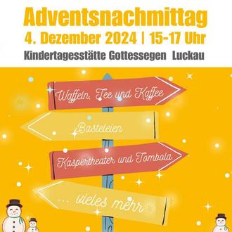 Die Kita Gottessegen lädt herzlich zu einem gemütlichen Adventsnachmittag am 4. Dezember von 15 bis 17 Uhr in ihre Räumlichkeiten, Nonnengasse 2 in 15926 Luckau, ein. Freuen Sie sich auf frisch gebackene Waffeln, Plätzchen, Kaffee und Tee sowie ein fröhliches Kaspertheater, Bastelspaß und eine spannende Tombola.
