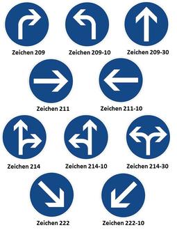 Alle Zeichen haben eins gemeinsam: sie bedeuten, dass bei diesen nur in die angezeigte Fahrtrichtung bzw. angezeigten Fahrtrichtungen gefahren werden darf und dass der Fahrtrichtungsanzeiger (Blinker) beim Abbiegen zu nutzen ist.