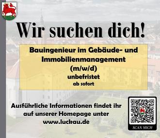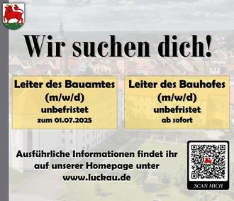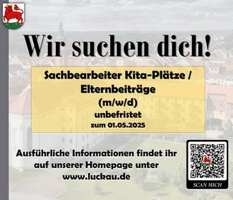 Auch das Hauptamt der Stadt Luckau würde sich über Unterstützung zum 01.05.2025 freuen. Wenn Sie Interesse an der Stelle als Sachbearbeiter für Kita-Plätze/Elternbeiträge haben, dann freuen wir uns über Ihre Bewerbung bis zum 10.04.2025.