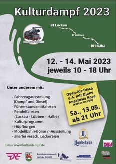 Auch in diesem Jahr möchte der DBV-Förderverein Niederlausitzer Eisenbahn e.V. und das wieder zum Leben erweckte Bahnbetriebswerk Luckau recht herzlich zu unserem Eisenbahnsfest am Luckauer Bahnhof einladen, welches in diesem Jahr erstmalig unter dem Namen KulturDampf stattfindet und der Name ist hier Programm: Vom 12.-14. Mai 2023 erwartet alle eisenbahnbegeisterte, schaulustige und interessierte Besucher eine bunte Mischung aus verschiedensten Lokomotiven, ob Dampf- oder Diesellok, sowie verschiedenste andere Schienenfahrzeuge. Außerdem gibt es allerhand technische und kulturelle Vielfalt. Von der Hüpfburg über Modellbahnen (inklusive Börse) bis hin zur Blasmusik ist für Jeden etwas dabei. Natürlich ist auch für das leibliche Wohl unserer Besucher gesorgt. Um nicht nur Eisenbahn anzuschauen, sondern auch zu erleben, bieten wir Pendelfahrten zwischen Luckau und Halbe, sowie Mitfahren auf verschiedensten Lokomotiven an. Als weiteres Highlight findet am Samstag, den 13.05. eine OpenAir Disco unter dem Motto „KulturDampf goes Electro“ statt.