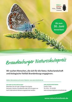Die Stiftung NaturSchutzFonds Brandenburg lobt auch in diesem Jahr wieder den Brandenburger Naturschutzpreis aus. Gesucht werden Menschen, die sich besonders für Natur, Kulturlandschaft und biologische Vielfalt Brandenburgs engagieren. Bewerben können sich einzelne Personen, Verbände, Vereine, oder Unternehmen sowie Schulklassen, Kindergruppen oder Arbeitsgemeinschaften.