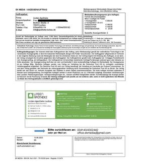 Aktuell werden in Luckau Unternehmen, die in der Informationsbroschüre der Stadt Luckau eine Anzeige haben, gezielt mit einem Trickformular/Anzeigenauftrag angeschrieben und telefonisch mehrfach täglich belästigt, so wie die Linden-Apotheke. Auf dem Formular sind bereits die Daten des Unternehmens eingetragen, die nur noch auf Richtigkeit überprüft und ggf. korrigiert oder ergänzt werden sollen. Die Anzeige stammt aus der offiziellen Informationsbroschüre der Stadt. Aus dem Begleittext ergibt sich jedoch, dass es sich dabei um eine Werbeanzeige ohne öffentlichen Auftrag handelt, die eine Gebühr für die Eintragung der Anzeige der Apotheke von jährlich netto 2.313 € mit einer Mindestlaufzeit von einem Jahr auslöst. Der Vertrag verlängert sich automatisch um ein Jahr, sofern dieser nicht drei Monate vor Ende der Vertragslaufzeit schriftlich gekündigt wird.