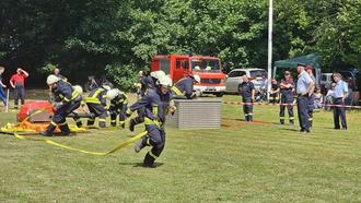 Anschließend konnten sich endlich die Kinder und Jugendlichen in der Gruppenstafette beweisen. Hierbei mussten die jüngsten Teilnehmer ihre Fähigkeiten im Kuppeln der Schläuche, im Knoten binden und im Zielspritzen mit der Kübelspritze unter Beweis stellen. Anschließend folgte der Löschangriff Nass der Jugendfeuerwehren. Den Abschluss des Wettbewerbs bildete der Löschangriff Nass der Männermannschaften. Folgende Platzierungen konnten erzielt werden: