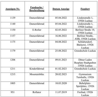 Aufgrund der Vorschriften des Bürgerlichen Gesetzbuches wird dem Empfangsberechtigten nochmals eine Frist zur Anmeldung ihrer Rechte bis 08.09.2023 gewährt. Die Fundsachen können gegen einen entsprechenden Eigentumsnachweis zu den Sprechzeiten bei der Stadt Luckau – Fundbüro- Raum 010, abgeholt werden.