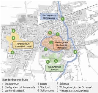 Der Projekttitel beinhaltet vier Handlungsräume in der Kernstadt Luckau. Diese für die Bürger und Besucher der Stadt Luckau wichtigen Aufenthalts- und Erholungsräume können im Zuge des Modellprojektes in ihrer vorhandenen Form nachhaltig aufgewertet und teilweise umgestaltet werden. So sind neben der Verbesserung der Wasserspeicherkapazität der natürlichen Gewässer, z.B. durch Entschlammung, Wiederherstellung der Böschungsbereiche und Ertüchtigung der Grabensysteme im Lagapark. Auch zusätzliche Bepflanzung von Bäumen und Gehölzen geplant, um beispielsweise an Hitzetagen die Aufenthaltsqualität in den städtischen Erholungsräumen zu erhöhen. Begleitende Maßnahmen wie die Entsiegelung von wasserundurchlässige Wegeflächen und die Pflanzung von klimaangepassten Staudenflächen im Bereich des Stadtparkes, der Stadtpromenade und am Schlossberg gestalten die Stadtlandschaft in Luckau in ihrem überregional bekannten Gartenstadtformat teilweise um.