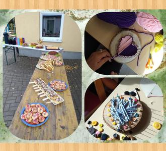 Ein weiterer Höhepunkt des Nachmittags war das gemeinsame Basteln von Laternen mit bunten Motiven. Des Weiteren zeigten die Kids ihren Großeltern eine besondere Technik, bei welcher Wolle um Reißzwecken an einer Holzscheibe gewickelt wurde, was zu schönen bunten Wollherzen als Ergebnis führte.