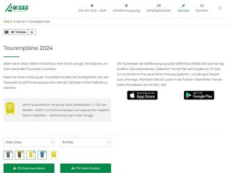 Internetseite www.awsas.de: Auch mit der Nutzung der Tourenpläne auf www.awsas.de erhalten Sie die Entsorgungsdaten schnell und individuell. Folgen Sie hierfür einfach dem Schnellzugriff „Tourenplan“ und wählen Sie zwischen verschiedenen Ausgabemöglichkeiten: Ein kompakte Seite im pdf-Format mit allen Jahresterminen - perfekt zum Aushängen im Hausflur oder an die eigene Pinnwand. Oder Sie laden die Entsorgungstermine als Kalenderdatei (ics-Datei) in den eigenen digitalen Kalender.