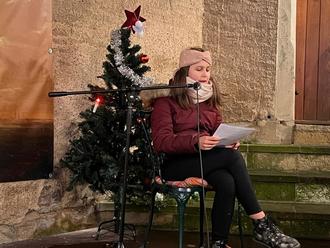 Die Zuschauer und Zuschauerinnen erwarteten zahlreiche kulturelle Beiträge, leckere Speisen und verschiedene Produkte wie eine Kurzgeschichtensammlung mit Texten unserer Schüler, selbstgenähte Artikel und Kinderschminken sowie Glitzertattoos. Auch der Weihnachtsmann war zu Besuch und verschenkte Süßigkeiten an große und kleine Kinder. Auf der Bühne konnte man ein französisches Theaterstück, Lesungen und Liedbeiträge bewundern. Die Schulleiterin Anke Littmann beispielsweise präsentierte ein „sächsisches Weihnachten“ mit Texten von Lene Voigt, Lisa Pütz, Lilian Winkler und Anne Braukhoff sangen Lieder und begleiteten diese mit dem Keyboard, Schüler und Schülerinnen der Klassenstufe 6 lasen Weihnachtsgeschichten vor. Es war ein rundum gelungener Nachmittag. Besonders bedanken möchten wir uns bei der Familie Rindfleisch, welche mithilfe der Gulaschkanone des Schützenvereins Hohenmölsen Gulasch verkaufte und sämtliche Ausgaben und Einnahmen dem Kinderhospiz gespendet hat.