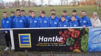 Die B-Jugend von der TSV Eintracht Lützen bedankt sich bei Yvonne und Mario Hantke EDEKA Lützen. Im Februar waren sie persönlich auf dem Sportplatz und übergaben neue Trainingsanzüge an unsere Spieler, dafür sagt das Team Dankeschön. Schon jahrelang unterstützt EDEKA unsere Nachwuchsmannschaften. In diesem Jahr werden wir im Juni den 10. EDEKA Fußballcup der D-Jugend gemeinsam austragen.