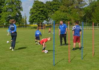 Nachdem man durch ein kurzes Spiel auch die koordinativen Fähigkeiten der Kinder prüfte, schlängelten sich diese dann mit dem Ball um Stangen und Hütchen bis hin zum Torschuss.