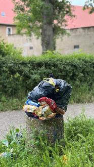 Leider fallen uns im Stadtbild auch immer wieder Mülleimer auf, die mit privaten Müllbeuteln zugestopft sind, so wie hier Mitte Mai hinter der Gaststätte „Roter Löwe“ in Lützen.
