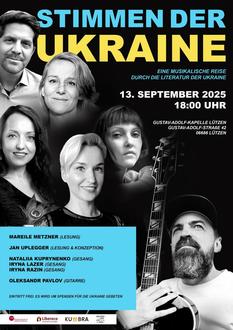 Dieser Frage gehen unter anderem Jan Uplegger und Mareile Metzner am 13.09.2025 in der Gustav Adolf-Kapelle nach. Gemeinsam mit den geflüchteten Sängerinnen Iryna Lazer, Iryna Razin, Nataliia Kuprynenko und dem Gitarristen Oleksandr Pavlov stimmen sie in einen literarischen und musikalischen Streifzug durch die Ukraine ein.