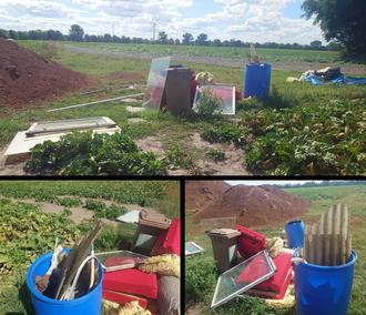 Offensichtlich stammt dieser Müll von einer Sanierung einer Wohnung oder eines Hauses. Fenster, Fliesentapete, ein Gartenpool, ein altes Sofa oder ausrangierte Fenster türmten sich zu einem stattlichen Haufen auf - flankiert von zwei blauen Tonnen und einer Biomülltonne, vollgestopft mit Unrat, welcher als bedenklich einzustufen ist. Glasfaserwolle oder eine 5 Liter Dose Universalverdünner gehören nicht in die Landschaft.