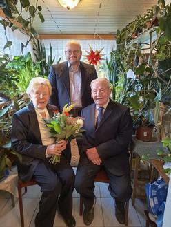 den Eheleuten Andreas und Ingeburg Blohinger zur Eisernen Hochzeit am 19.12.2024. Für die kommende Zeit wünschte er noch viele glückliche Ehejahre.