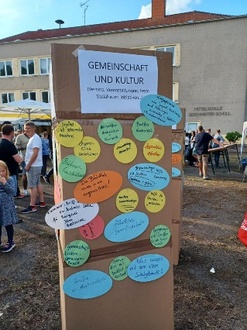 Ein weiterer Teil der Veranstaltung war eine Aktion von Katja Stumpf und Sebastian Ludwig mit der Frage „Zukunft Neukieritzsch und seine Ortsteile! Was wünscht Ihr Euch?“ Hier konnten alle Bürger*innen zu verschiedenen Aspekten an Pinnsäulen ihre Ideen aufschreiben, u.a. zu Gemeinschaft und Kultur, Begegnungsorte und Gestaltung der Gemeinde, Schulen und Kindergärten, Mobilität. Antrieb war ein einfaches Format zu probieren, um Ideen und Wünsche von den Menschen, die hier leben, aufzunehmen, welche die Gemeinde bei zukünftigen Entscheidungsprozessen mit berücksichtigen kann. Es kamen viele gute Ideen zusammen, welche der Gemeindeverwaltung übergeben wurden.