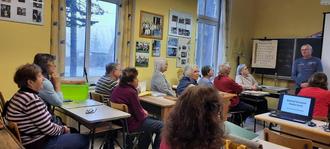 Alle Plätze besetzt: Das alte Klassenzimmer der Geschichtswerkstatt. Gerd Janietz, Vereinsvorsitzender der Geschichtswerkstatt (2.v.r.) stellt den Besuchern die Geschichtswerkstatt vor.