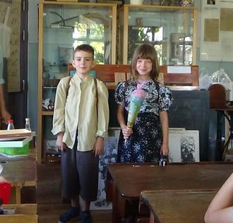 Frau Konecht, die Museumsleiterin, begrüßte uns schon freundlich an der Eingangstür. Schnell durften wir das alte Klassenzimmer betreten, in dem ab 1898 Unterricht erteilt wurde. Wir erfuhren, dass die Schüler der damaligen Zeit meist nur sorbisch sprachen und täglich zu Fuß den langen Weg aus den umliegenden Dörfern in die Schule gingen. Es gab ja noch keine Busse und Elterntaxis. In der Erntezeit blieben die Kinder oft zu Hause und mussten auf den Feldern helfen.