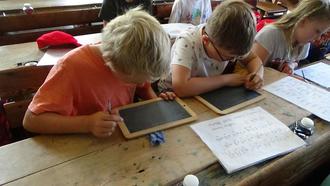Die Museumsleiterin zeigte uns, wie man mit dem Griffel auf der Schiefertafel und mit der Gänsefeder auf graues Papier schrieb. Natürlich konnten wir das alles auch gleich ausprobieren. Das machte richtig Spaß und keiner vermisste den Computer, die elektronische Tafel oder das Tablet.