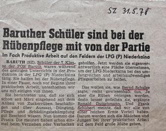 Lasst mich zum Schuljahr 1977/78 zurückkehren! Am 31.5.78 berichtete ein SZ-Artikel über die Arbeit meiner 7. Klasse auf dem Rübenfeld.