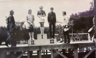 Auf dem Foto von 1973 seht ihr Birgit Rudel als Siegerin, links Sportlehrer Siegfried Hartstein.